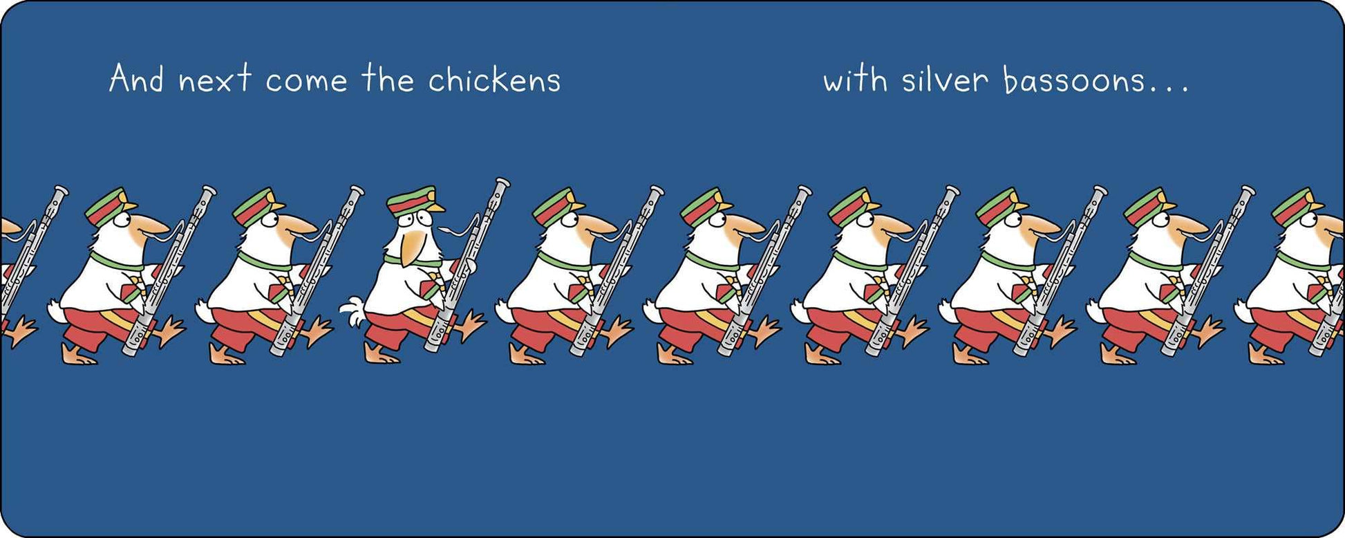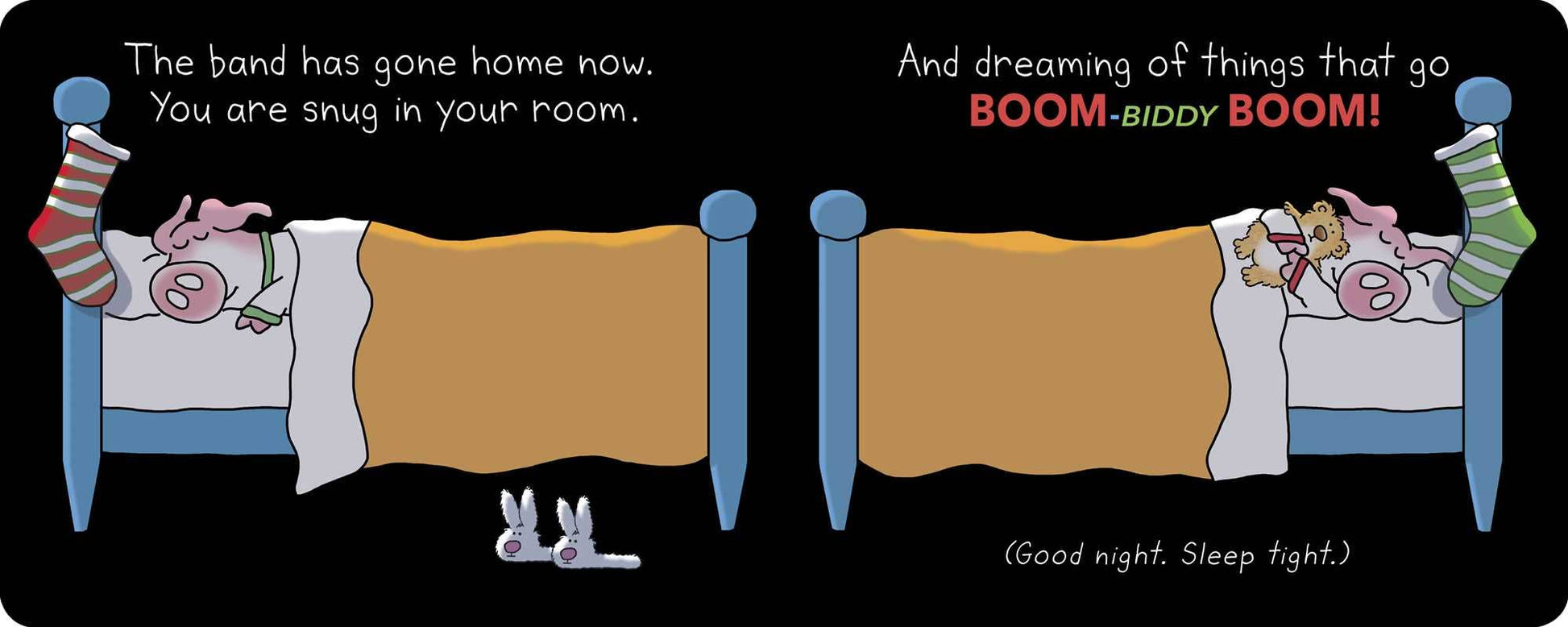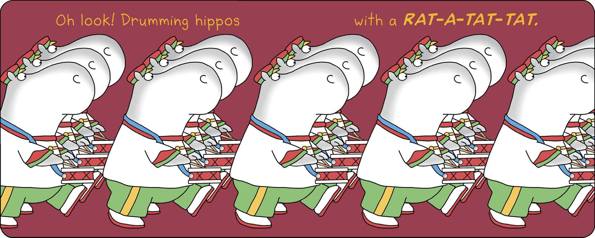 From this rousing beginning unfolds Christmas Parade, a merry board book filled with hilarious characters from the one and only Sandra Boynton! Written with the irresistible rhythm of a lively marching band and illustrated with Boynton’s signature characters, including chickens with bassoons, mice with piccolos, a tiny bird with a large tuba, and a Santa rhino with a sack full of presents, Christmas Parade is a superb present for young children and families everywhere. BOOM-biddy! BOOM-biddy! BOOM BOOM BOOM… What’s that noise filling the room? I think that’s the sound of the CHRISTMAS PARADE! Run to the window! Pull up the shade!