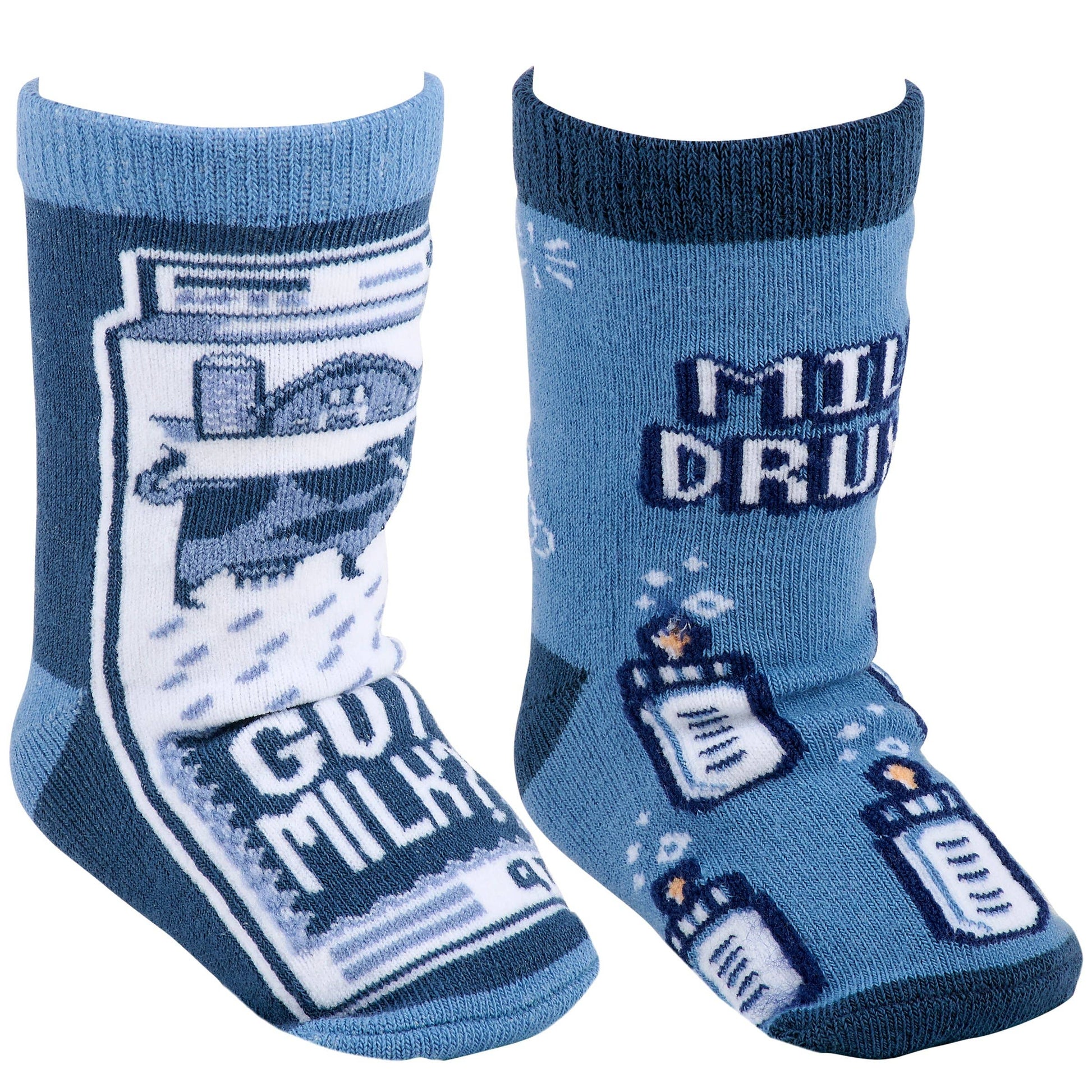 Two pairs of cozy baby socks in a giftable set from our Baby & Kids Collection displaying funny milk-themed designs on each pair. Baby socks feature a fun milk carton design with "Got Milk?" sentiment as well as a pattern of baby bottles with fun sentiment that reads "Milk Drunk." Both baby sock designs are replicated from original hand illustrated art. Socks are sized to fit a 0-12 month baby and made with a cotton, nylon, and spandex blend for a snug fit.